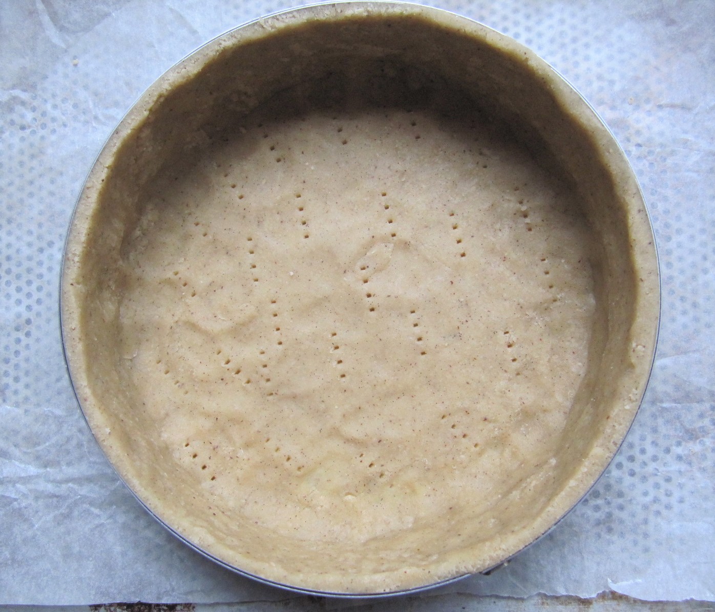 Etaler la pâte sablée entre deux feuilles de papier sulfurisé (ne surtout pas fleurer). Foncer de pâte, le cercle beurré posé sur une plaque recouverte de papier sulfurisé. Piquer à la fourchette.