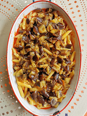 Couper les aubergines non épluchées en dés et les placer au MO une dizaine de min : elles vont rendre toute leur eau de végétation et être tendres. Pendant ce temps, faire revenir les oignons finement émincés dans l'huile chaude. Réserver. Dans la même poêle, faire dorer les aubergines égouttées. Plonger les penne dans l’eau bouillante salée et compter juste 5 min après la reprise de l'ébullition. Les pâtes sont loin d'être cuites, c'est l'objectif. Égoutter très soigneusement.