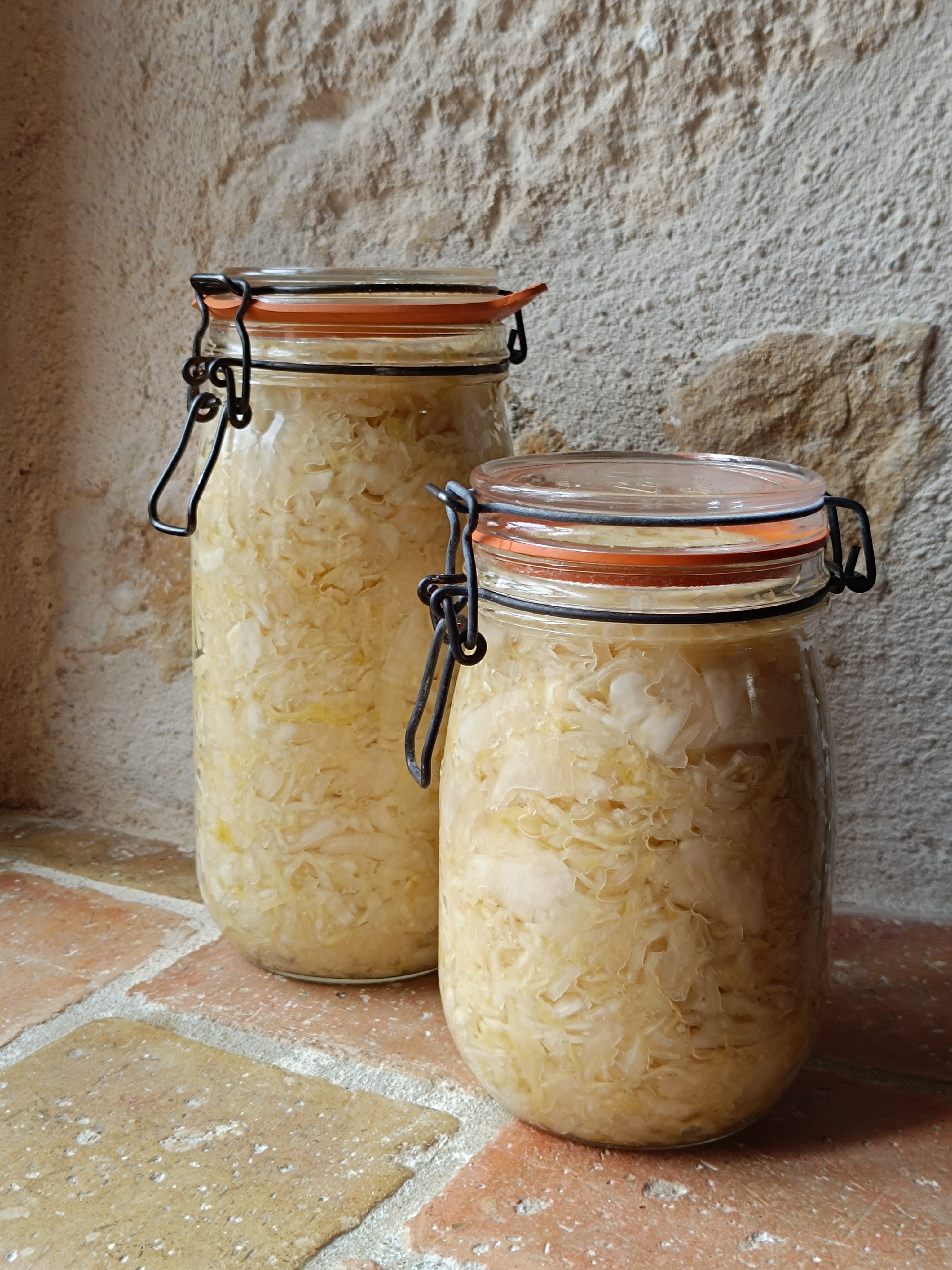 J'ai des difficultés dans ma région pour trouver de la choucroute crue. Alors, je me suis penchée sur la lacto-fermentation et ne le regrette pas car c'est enfantin à préparer. Tassé dans des bocaux, le chou émincé en fines lanières puis salé, subit une fermentation lactique durant cinq semaines, à l'abri de l'air et de la lumière.